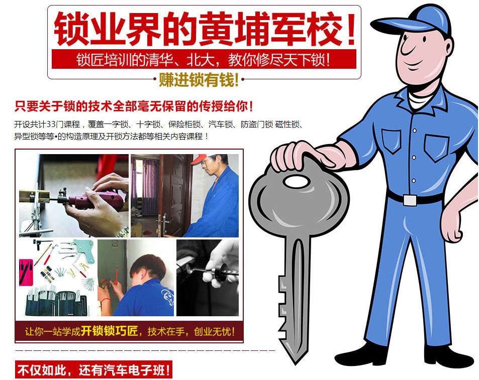 我们的优势在于,能够让学员在激烈的市场竞争中,通过一技之长,稳立于社会,并能让其获得丰厚的物质回报。学习开锁学员学员在培训过程中,不仅能够掌握开修各种家居锁、各种防盗门锁、机械保险柜及电子保险柜、各种汽车锁等各类锁具,并能自己制造出理想的开修锁工具,解除了学员购买大量工具的烦恼。制锁班学员在培训过程中,不仅能掌握锁具设计及制造工艺技术而且能够通过开锁技术,以矛测盾以盾试矛开阔思想研制出新型锁具。
